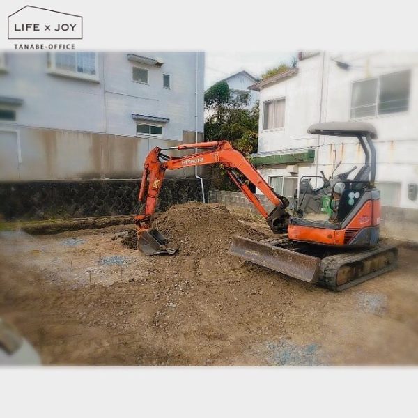 地盤改良工事が終わり、いよいよ基礎工事です。建物の形に沿って掘り方工事が進められています。