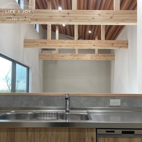 #楽しい家づくり 勾配天井×あらわし梁 視線が抜ける天井の高さと、構造美をそのまま活かした、洗練された空間デザイン。 経年による色味や質感の変化も楽しめ、開放感あふれる住まいに仕上がりました。